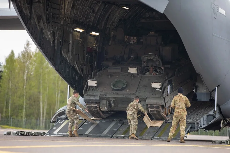 Estonya’nın Tartu Havalimanı’nda ABD ordusu’na ait bir M2A4 Bradley Zırhlı Muharebe Aracı, 8 Mayıs 2025’te ABD Hava Kuvvetleri’ne ait bir C-17 Globemaster III nakliye uçağına yüklenmek üzere hazır hale getirildi.
