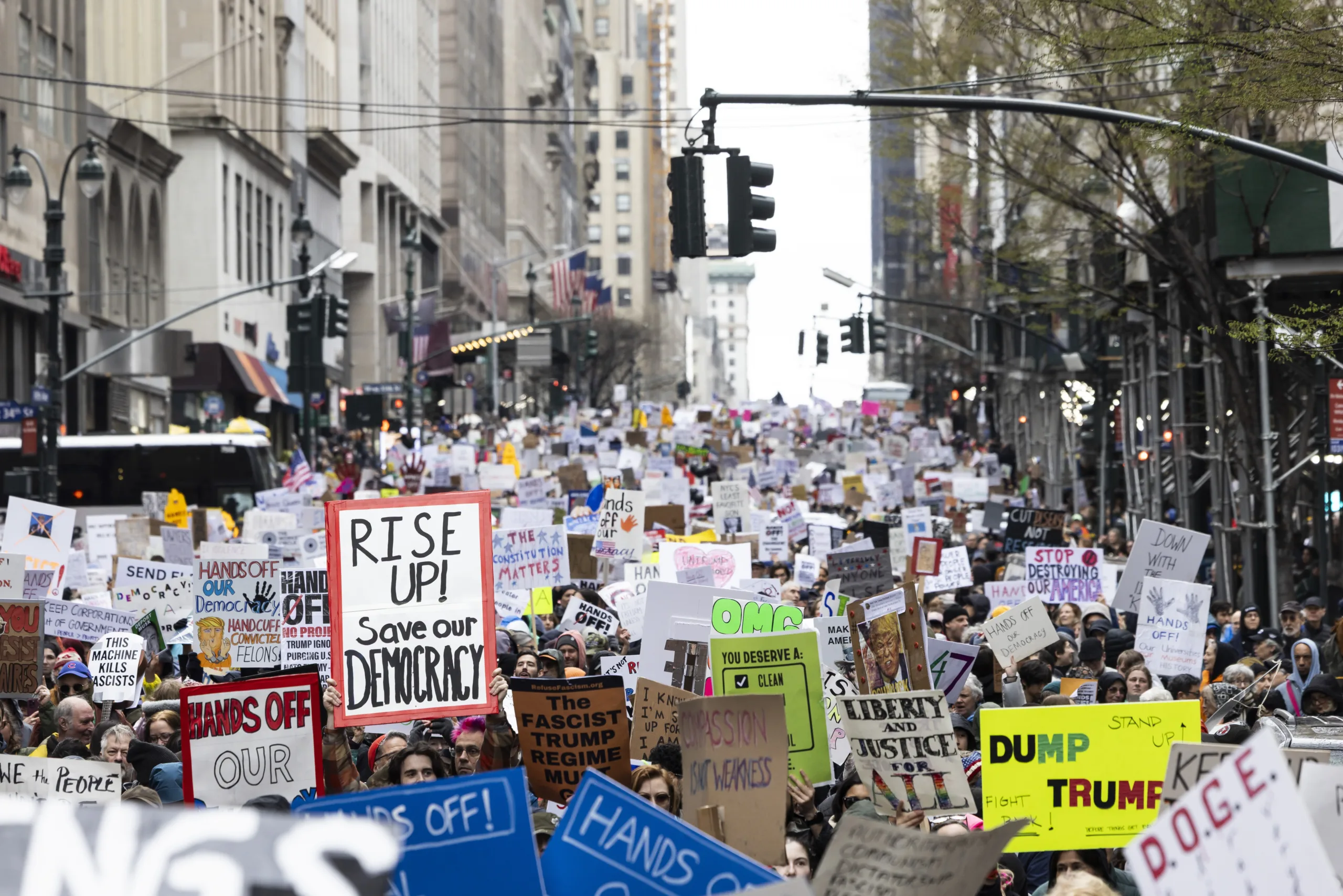 ABD’nin 50 eyaletinde eş zamanlı olarak yaklaşık bin 200 protesto gösterisi düzenlendi. Göstericiler, ABD Başkanı Donald Trump ve Hükümet Verimliliği Departmanı'nın (DOGE) başında bulunan Elon Musk’ın politikalarını protesto etmek üzere başkent Washington D.C. ve New York başta olmak üzere ülke genelinde sokaklara çıktı.