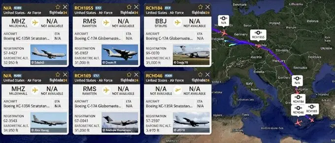 Bu uçuşların yanı sıra Flightradar24 üzerinden çok sayıda ABD Hava Kuvvetleri'ne ait KC-135 ve KC-46 yakıt ikmal tankerleri ile C-17 nakliye uçaklarının Avrupa üzerinden bölgeye, özellikle Ürdün ve İsrail'deki üslere aktığı gözlemlenmiştir.