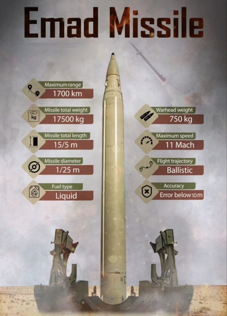 Emad, İran’ın bugüne dek geliştirdiği en gelişmiş orta menzilli balistik füzelerden biridir. Şahab-3 füzesinin modernize edilmiş bir versiyonu olan bu sistem, sıvı yakıtla çalışıyor ve 750 kilogramlık savaş başlığını 1.700 kilometre menzile ulaştırabiliyor.