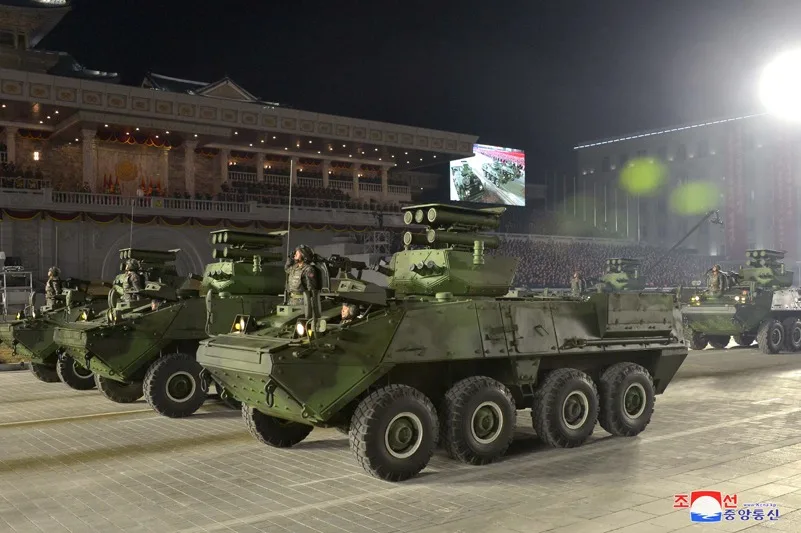 Araç, daha önce Kuzey Kore’de farklı yükler taşıyan Stryker tipi 8x8 görünümlü araçlarla aynı hatları paylaşıyor ve ortak bir taban platformundan türetilmiş izlenimi veriyor.