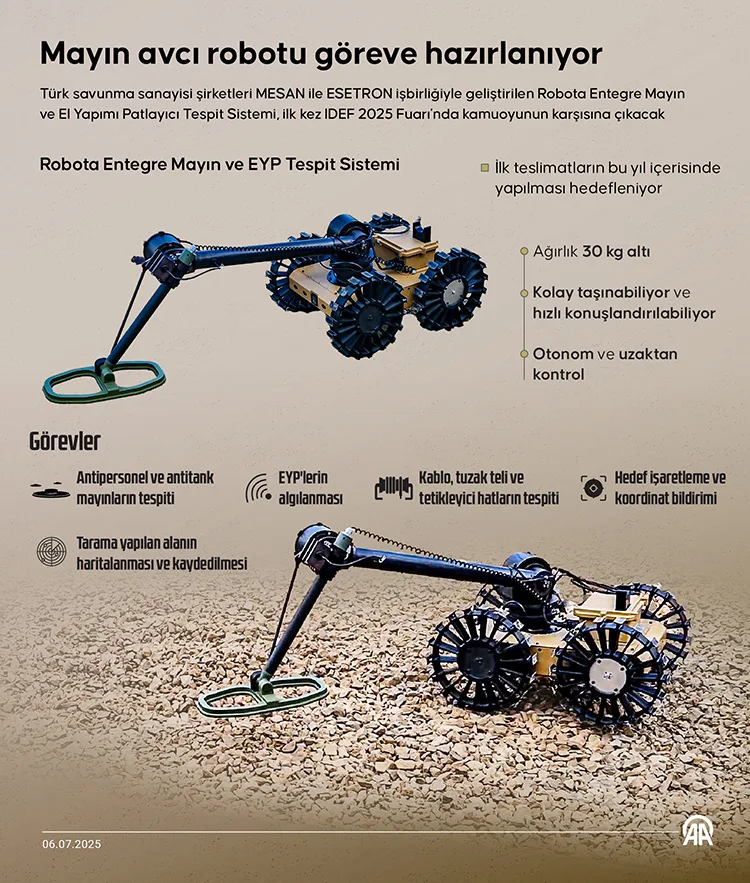 Türk savunma sanayisinin kabiliyetlerinin bir araya getirilmesiyle, mayın ve el yapımı patlayıcı (EYP) tehditlerine karşı güvenli ve etkin bir çözüm sunmak amacıyla bir Mayın ve EYP Tespit Robotu geliştirildi. Sinsi düşman olarak da adlandırılan bu tehditlere karşı geliştirilen sistem, ilk kez IDEF 2025 Fuarı’nda tanıtılacak.
