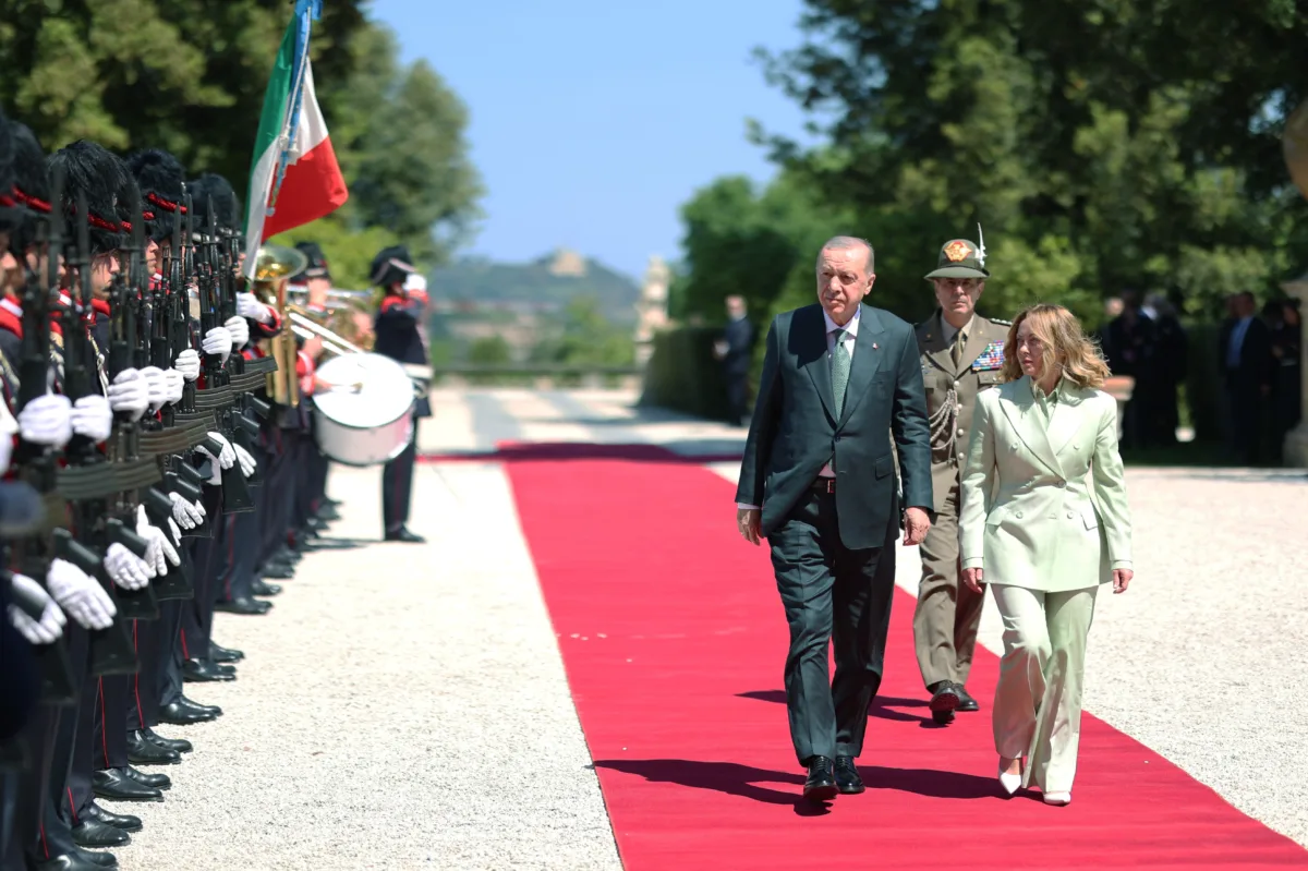 Tören alanı olarak belirlenen Villa Doria Pamphili'de, Erdoğan'ı İtalya Başbakanı Giorgia Meloni bizzat karşıladı. Samimi bir atmosferde geçen karşılama töreninin ardından liderler baş başa bir görüşme gerçekleştirdi, ardından iki ülkenin bakanları ve üst düzey yetkililerinin katılımıyla heyetler arası toplantılara geçildi.