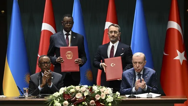 Cumhurbaşkanı Recep Tayyip Erdoğan ve Ruanda Cumhurbaşkanı Paul Kagame’nin katılımıyla Türkiye ile Ruanda arasında 4 önemli anlaşma imzalandı. Anlaşmalar arasında savunma sanayii iş birliği ve medya alanında mutabakat zaptları bulunuyor.