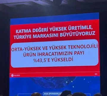 Savunma sanayi ihracatımız neredeyse yüzde yüz artarak 10 milyar 54 milyon dolara ulaştı. Orta- yüksek ve yüksek teknolojili ürün ihracatımız %43,5'e yükseldi.