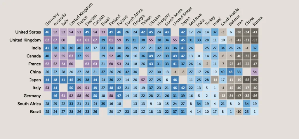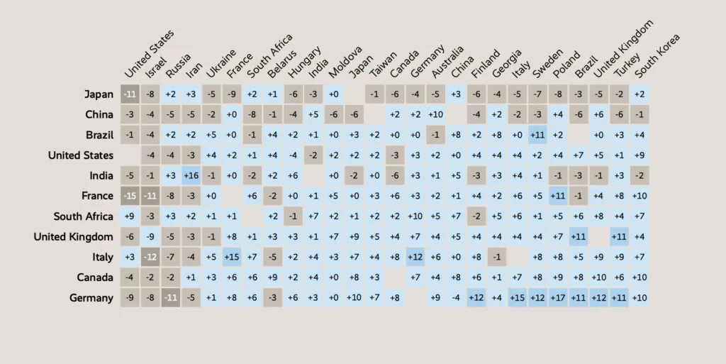 Raporda, ABD ve İsrail’in “müttefik” olarak görülme oranlarının gerilediği belirtiliyor. ABD’yi “müttefik” olarak algılayanların oranı Fransa’da 15 puan, Japonya’da 11 puan, Almanya’da 9 puan ve İngiltere’de 6 puan azaldı.