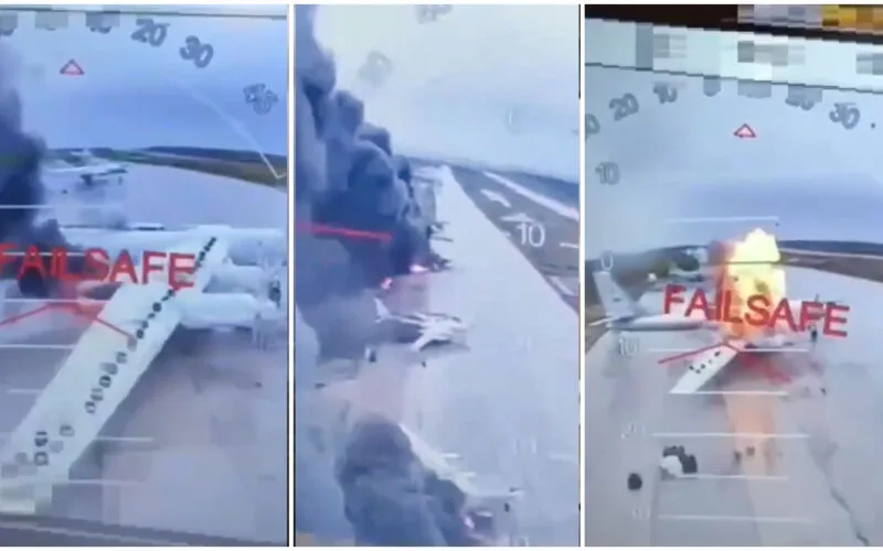 Saldırıya ait olduğu iddia edilen görüntülerde, Rus üslerine yakın bölgelerde park edilmiş sivil kamyonlardan FPV tipi İHA’ların havalanarak hedeflere yöneldiği görülüyor.