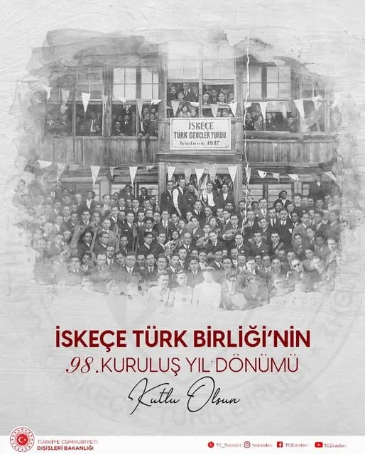 Türk Dışişleri Bakanlığı, Batı Trakya'daki Türk azınlığın 98. yılını kutlarken, İskeçe Türk Birliği'nin, "Batı Trakya Türk azınlığının en eski sivil toplum kuruluşu" olduğunu belirtti. Paylaşımda ayrıca, Avrupa İnsan Hakları Mahkemesi kararlarına uygun olarak, Türk Birliği'nin "adını kullanma hakkını" savunduğu ifade edildi.
